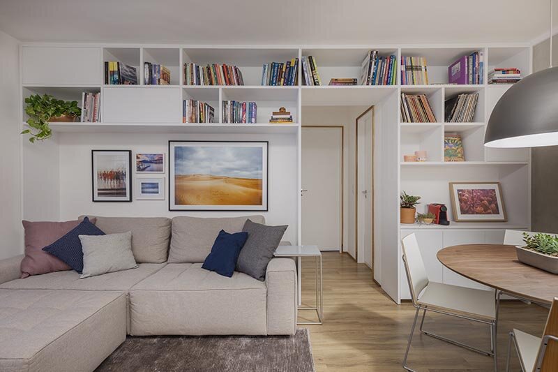 Проект квартиры в Сан-Паулу (Бразилия) был разработан студией DMDV Arquitetos за 30 дней, и за 90 дней – реализован вплоть до мельчайших деталей. Основная цель – создать комфортное гибкое пространство с красивым дизайном. Архитекторы отдали предпочтение современному языку, с преобладанием светлых тонов, дерева и предметов, привезённых из путешествий по всему миру. Модернизация квартиры площадью 60 кв. м включала в себя новые покрытия, мебель и освещение. Пространство должно было быть максимально гибким, ведь дом создан для супружеской пары, их дети бывают только по выходным. Новая конфигурация пространства заключалась в увеличении общественной зоны и уменьшении комнаты-кабинета, в которой редко кто бывает – в ней находятся лишь диван-кровать и стол. На карте мира стикерами указаны места, которые пара уже посетила. Все помещения гомогенизированы с помощью единого винилового пола, плинтусы сделаны из дерево фрейжо, цвет которого хорошо корреспондирует с оттенками напольного покрытия. Ф