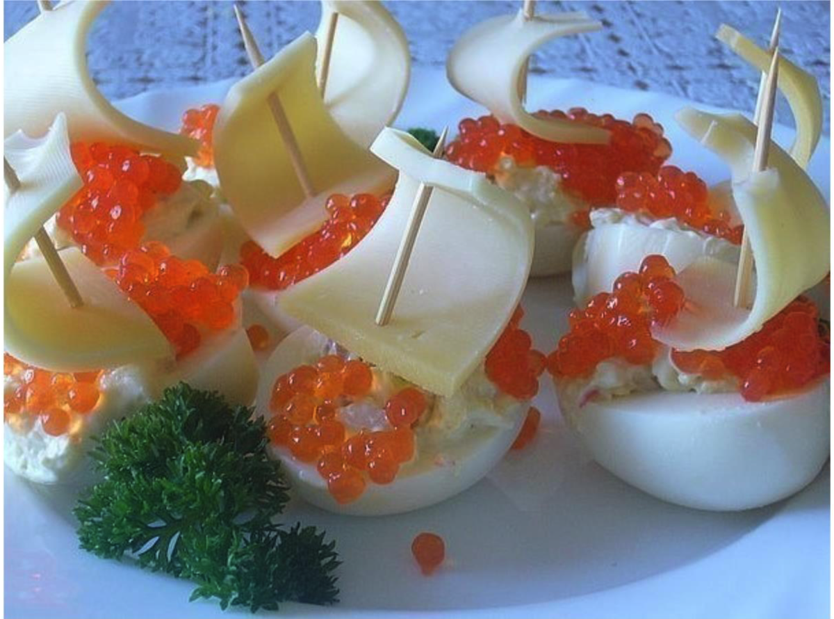 11. Отваренные вкрутую яйца разрезать пополам и вынуть желток, желток смешать с майонезом и молотым перцем, нафаршировать белки, сверху выложить красную икру и украсить сыром на шпажке. 12. Пингвинчики: маслину разрезать вдоль и нафаршировать творожным сыром, насадить на шпажку, сверху насадить еще одну маслину, из вареной моркови сделать клюв и лапки. 13. Белый хлеб, помидор, кусочек сыра, копченая колбаса, огурец и маслина, насадить все на шпажку. 14. В виде деталей шапочки Деда Мороза нарезаем банан и клубнику, виноград в роли головы, надеваем на шпажку. 15. Также можно сделать фруктовые канапе, любые фрукты на ваш выбор насадить на шпажки, их можно украсить шоколадной крошкой или обмакнуть в растопленный шоколад. Если хотите больше клёвых рецептов, то вам необходимо поставьте лайк и подписаться на канал:)