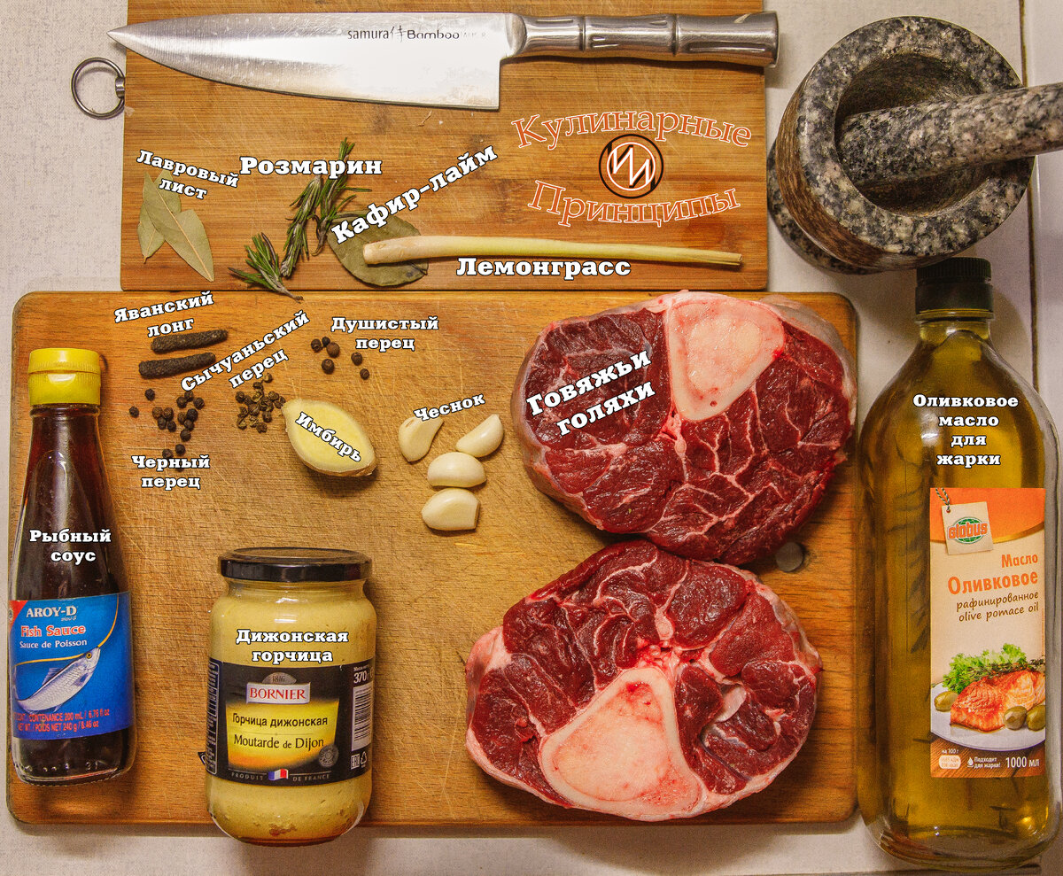 Сейчас я расскажу, как приготовить самый дешевый кусок говядины и сделать его нежнее вырезки. *В рецепте присутствуют ингредиенты, которые есть не на каждой кухне. Просто, замените их другими или не используйте вовсе. Вкус сильно не изменится, технология приготовления важнее. На приготовление блюда вы потратите не более 20 минут своего времени. Но, долго маринуется и долго стоит в духовке. Общее время приготовления 8-12 часов. Ингредиенты: Говяжьи голяшки - 2 шт. Чеснок - 6 зубчиков Имбирь - кусочек около 3 см. Горчица дижонская - 1 ст.л. Лавровый лист - 2 шт. Лемонграсс - 1 шт. Кафир-лайм - 1 шт. Черный перец - 10-12 шт. Душистый перец - 5-6 шт. Сычуаньский перец - 10-12 шт. Яванский перец лонг - 2 шт. Рыбный соус - 4 ст.л. Оливковое масло - 1 ст.л. Погнали! Все специи (кроме душистого перца), а также чеснок и имбирь, растолките в ступке. Смешайте с оливковым маслом, горчицей и рыбным соусом. Разотрите маринадом голяшки и положите их в пакет для запекания. Закиньте следом лемонгр