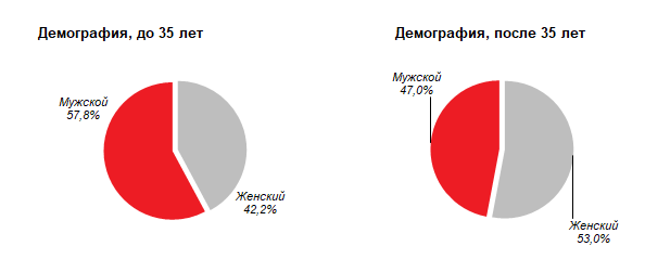 Аналитики Est-a-Tet выявили портрет покупателя новостроек комфорт-класса в Москве, разделив всех на две возрастные группы: до 35, а также от 35 лет. Рассмотрели цели покупки, способы оплаты и предпочтения по метражу. Больше половины покупателей находится в возрасте 30 лет. Доля мужчин составила 57,8%, женщин, соответственно – 42,2%. При этом стоит учитывать, что в семейных парах решение принимается совместно. В старшей возрастной группе доля мужчин снижается до 47%. В зависимости от возраста, брачный статус покупателей диаметрально противоположный. Наиболее наглядные данные у мужчин: в возрасте до 35 лет - 42% покупателей мужчин - холостые, (36% женщин – незамужние). После 35 лет доля женатых мужчин составляет 82,4%, а доля замужних женщин вырастает до 56,4%. Женщины, вместо студий и однокомнатных квартир, предпочитают покупать двухкомнатные (37,8% вместо 26,2%). У мужчин с возрастом происходит незначительное снижение спроса по всем типам, кроме трехкомнатных - их доля, н