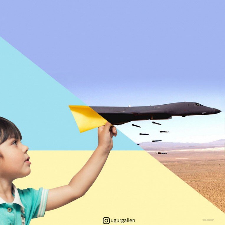 Каждый из нас живет в своем собственном "удобном, комфортном" мире и мало что знает о том, что происходит за его пределами. Будь то война, голод, массовые убийства, террор, - все это нас не касается, мы живём в другом мире. Мы так привыкли, ведь что мы можем сделать для тех, кто не знает, что такое поесть досыта или выйти спокойно на улицу и не бояться, что тебя случайно пристрелят или ранят. Мы знаем что-то из новостей, знаем о трагедиях и их жертвах лишь в цифрах и сухих фактах, но увидеть настоящий ужас испытываемый людьми приходится не многим. Уур Галлен блогер из Турции, он взял на себя миссию показать миру, то что творится на самом деле за пределами "мирной"жизни. В своем аккаунте Инстаграм он публикует работы в которых наглядно демонстрирует этот страшный разрыв между мирной жизнью и жизнью в центре войны, разрыв между благополучием и нищетой. Его работы заставляют сердца сжиматься, ведь реальность некоторых людей это постоянный страх и борьба за жизнь. А ещё они уч