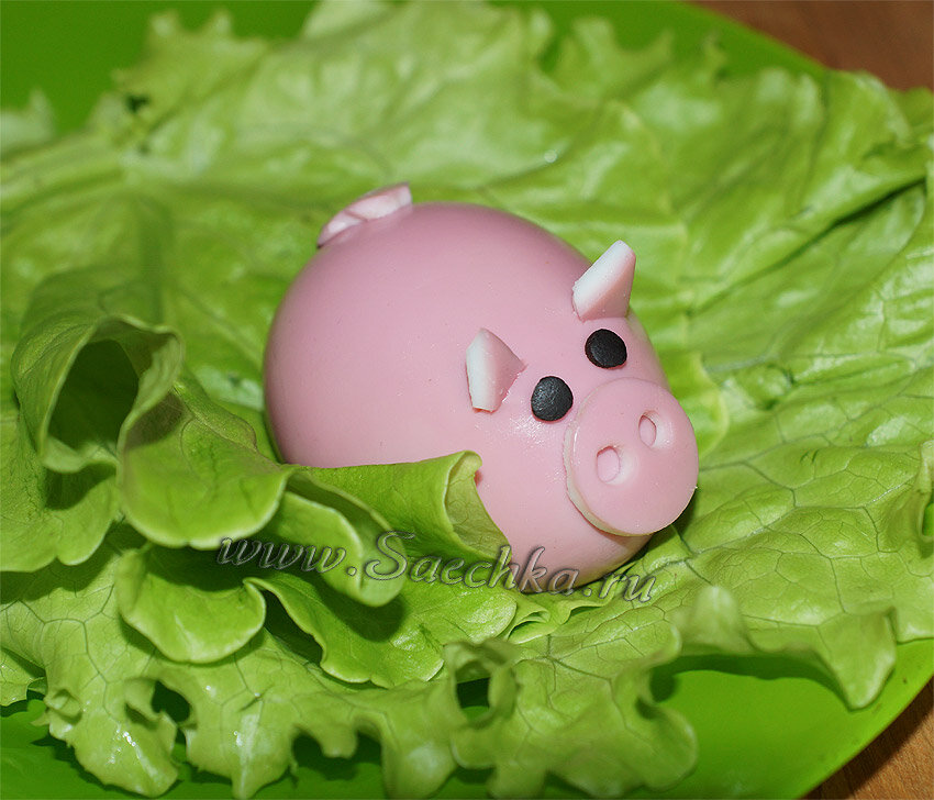 Срезаем нижнюю часть для устойчивости и из обрезка делаем "уши", "пятачок" и "хвостик" поросёнка. Дырочки я вырезала трубочкой для коктейля, как и глазки из маслины. Глаза еще можно сделать из перца или гвоздики, рот - лавровый лист (я рот вообще не стала делать - не видно).