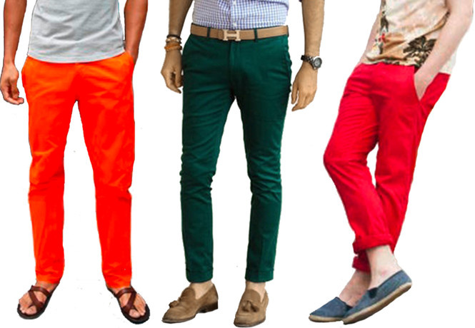 - Обзаведись одной парой брюк чинос яркого цвета для летнего отдыха. Например, красными, зелеными или оранжевыми. Комбинировать их можно с футболками и рубашками нейтральных оттенков, ни в коем случае не с яркими. А то экстренная служба помощи дальтоникам повяжет тебя прямо на улице.