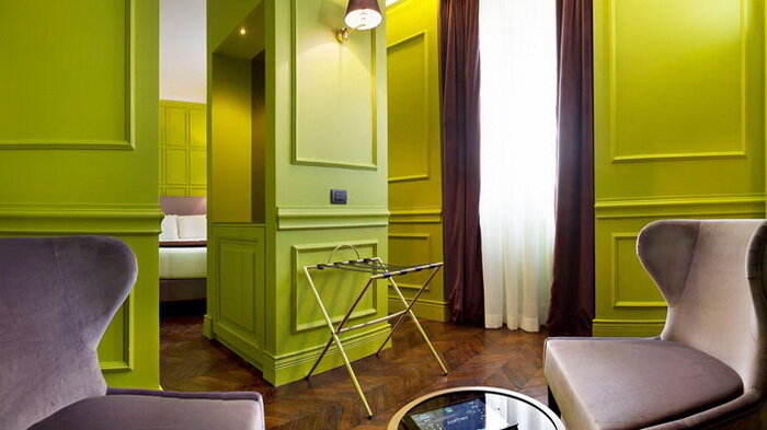 Этот отель в Риме привлекает внимание своей необычной формой и яркой расцветкой. Архитектура здания, построенного в начале 20-го века, выполнена в ретро-классическом стиле. Отель умело отреставрирован, а цветовое оформление фасада приятно радует глаз. Домик аккуратный, милый и уютный. В номерах этого отеля хочется отдохнуть от повседневных забот, окунувшись в мир роскоши и беспечности. В отеле всего 11 номеров, поэтому обстановка уютная и домашняя. К дому прилегает просторный двор, на котором проходят обеды. Номера в отеле просторные и светлые. Дизайн интерьера отеля игривый, современный и при этом элегантный. Буйство красок, которые используются в оформлении комнат, придают обстановке оптимизм и радостное настроение. Гармоничное сочетание декора и предметов мебели создают ощущение расслабленного шика, что превращает каждый номер римского отеля в тихий оазис. Необычное дизайнерское решение – огромный диван под стеклянной полукруглой стеной, переходящей в крышу. На нем приятно уединит
