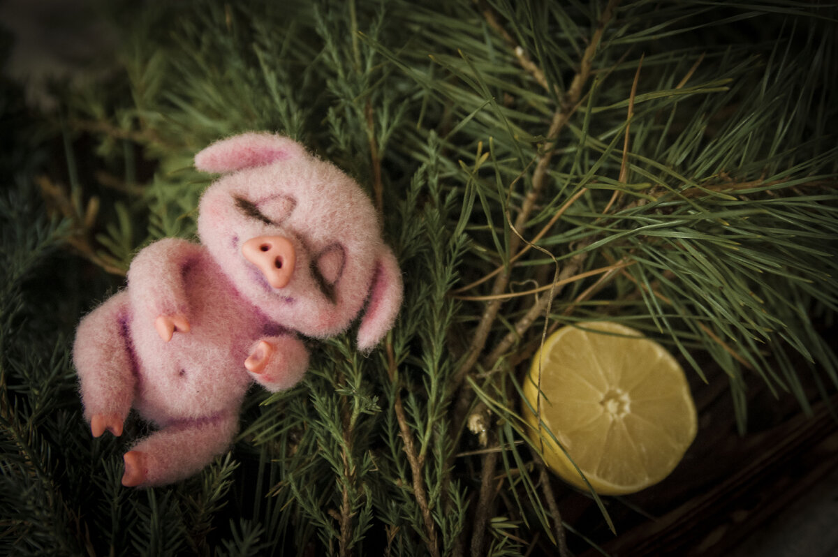 Простой и понятный мастер-класс по очаровательной свинке. Заказала мне эту игрушку девушка-фотограф, которая снимает новорожденных деток. Игрушки-сплюшки - это реквизит. Их уже целая коллекция вышла, самая любимая - лисичка, она прямо очень удачная получилась! Ну а свинка - к новому году была заказана. Очень рада, что получилось отснять процесс работы над ней, вдруг кто-то из моих читателей давно хотел попробовать работать с шерсть, да не решался. На самом деле - все очень просто! Немного о материалах. Для работы вам понадобится шерсть для валяния (у меня ушло примерно 25 гр), две иглы: обратная и обычная, полимерная глина розового цвета, 1,5 часа времени. Итак, формируем руками овал и слегка прихватываем его иглой. Так же из цельного кусочка материала формируем голову, добавляя по мере необходимости шерсть к заготовке.