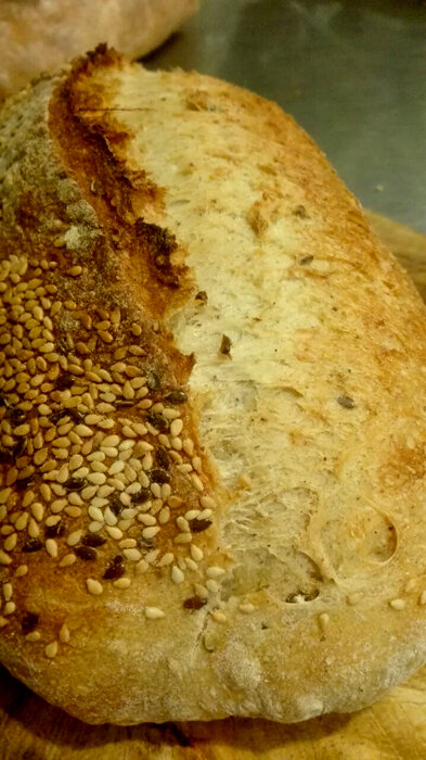 У меня два рецепта солодового хлеба в ходу, и в обоих случаях я использую солод по-разному. Солод (он представляет из себя пророщенные и подсушенные зерна ячменя, к примеру, а так же пшеницы, ржи и других культур) относят у натуральным улучшителям хлеба, потому что содержащиеся в нем энзимы и питательные вещества, которыми должно пользоваться будущее растение — роскошный стол для дрожжей, где им дадут сет из закусок, три горячих на выбор и компот. Дрожжи развиваются стремительно, мякиш получается мягчайшим, а корка — более хрустящей, потому что сахара из солода делают её такой. Он готовится на pate fermentee, то есть на "старом тесте". Оно готовится с вечера и оставляется на ночь в тепле. на 2 батона Pate fermentee: 100 г пшеничной муки 70 г воды 0,6 г дрожжей (не 6 граммов, а 0,6) 2 г соли Тесто: 450 г муки 310 г воды 9 г соли 1,2 г дрожжей 18 г молотого в кофемолке солода весь pate fermentee 10 г семян льна 10 г кунжута Смешайте муку и воду, оставьте на 15-минутный автолиз. Добавьте