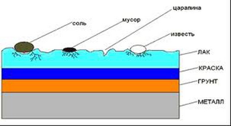 Кислотные осадки, соль, вода, реагенты постепенно проникают в глубь краски и начинается неизбежный процесс химической реакции. Так возникает коррозия. Если не предпринимать дополнительных мер, в виде защитной полировки, то через некоторое время появятся первые «веснушки», а от них не далеко и до первых ржавых пятен. Нужно отметить, что в городах этот процесс идет значительно быстрее.