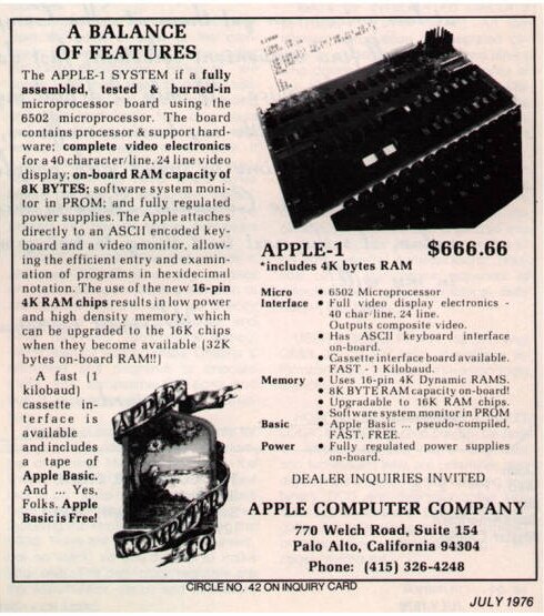 Apple известна на весь мир не только революционными продуктами опередившими свое время, но также и нестандартными рекламными кампаниями. С момента своего основания Apple использовала в своих рекламных буклетах качественные изображения продуктов, яркие и запоминающееся слоганы. Благодаря ресурсу TheMothership мы можем ознакомиться с полной коллекцией рекламных объявлений компании с 1976 год по 2018 год. Предлагаем вам окунуться в историю, взглянув на них. В 1976 году Apple выпустила свой первый рекламный материал. Выглядел он следующим образом: В те времена компания предлагала потребителям компьютер Apple-I. Стоимость устройства составляла внушительные 666,66 долларов, как рассказывают, потому что Возняк любил повторяющиеся цифры, и потому что они изначально продавали его в местный магазин по цене в 500 долларов, к которой добавилась наценка в одну треть. В силу того, что компьютеры были распространены очень слабо в 1980-х годах, компания делала особый акцент на демонстрации возможнос