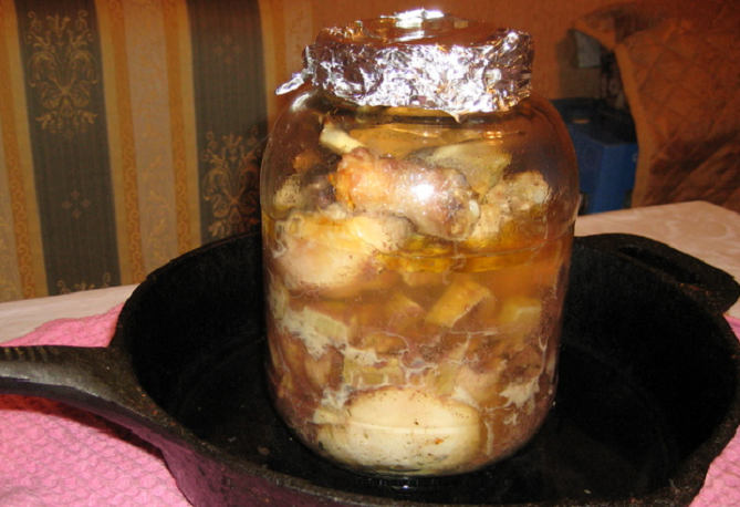 Вкуснейшая курочка! Просто пальчики оближешь! Мягкая, сочная, нежная и ароматная... одним словом - объедение! Подавать можно с чем угодно, хоть с кашами, хоть с картошечкой, желательно еще и салатца из овощей подрубить) К тому же приготовление такой вкуснятины не отнимет у вас много времени, я имею в виду активное время, то есть то, что вы реально потратите занимаясь курицей. Быстренько моем, режем, смазываем, перекладываем все в банку, ну буквально минут 15-20 и вы свободны. Потом конечно придется подождать полтора-два часика, но вы ведь за это время успеете переделать кучу дел, так что время пролетит незаметно) Нам понадобится: курица весом 1,5-1,7 килограмма 5-6 крупных зубчиков чеснока 2-3 мелкие луковицы столовая ложка готовой горчицы из баночки десяток мелких шампиньонов грамм 50 сливочного масла пара листиков лаврушки соль, перец - по вкусу. Кстати, о вкусной и здоровой еде можно прочитать здесь: Салат "Мужская мечта" - быстро, просто и вкусно Мягкий и нежный сыр "Филадельфи