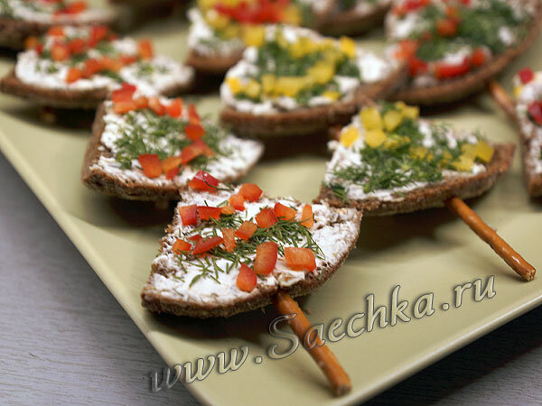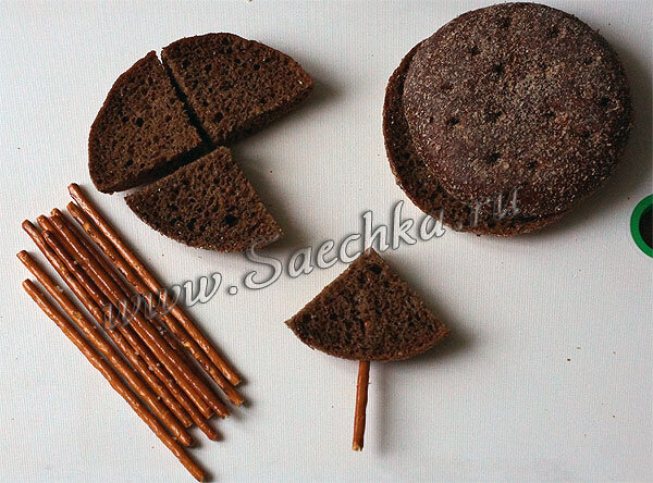 - Хлебцы разрезать на 4 части, как на фотографии. В каждый получившийся треугольник вставить по соломке.