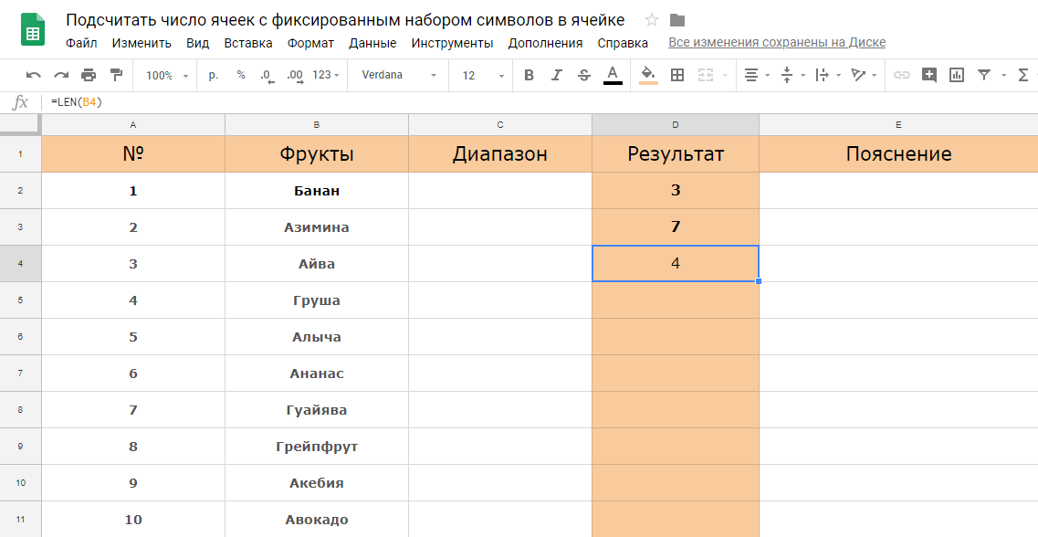 Если мы хотим подсчитать, конкретно, в каждой ячейке количество символов, в Google таблицах, достаточно воспользоваться функцией len(). В моем примере есть список фруктов. В клетке ‘B4’ стоит ‘Айва’ = 4 символа. Чтобы подсчитать это через функцию, в строке для формулы необходимо набрать: