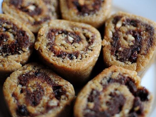 - С охлажденного теста снять пленку. Рулеты нарезать ломтиками по 0,5 см. Выложить с интервалом 5 см на смазанные жиром противни. Выпекать при 180°С 8-10 минут. Переложить на решетку для остывания.