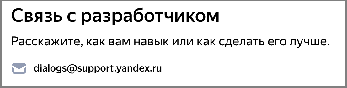 Мы просим всех разработчиков навыков заполнить это блок, чтобы иметь возможность получать обратную связь от пользователей. Команда Диалогов P. S. Подписывайтесь на наши каналы