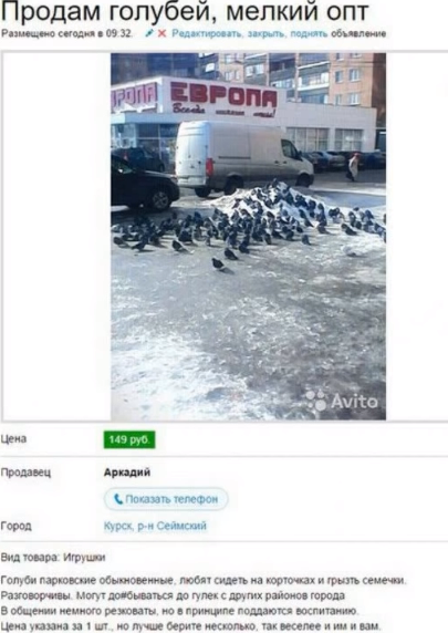 Пока готовятся статьи про мошенников и аферистов, предлагаю Вам просто отвлечься и посмотреть интересные объявления которые выкладывают на Авито. Читайте само объявление, обычно самое смешное там :) 1. На авито даже продают голубей 2. Мангал 3. Автомобиль с небольшой вмятиной 4. Боеголовка 5. Наушники не нужны? Всем хорошего и позитивного дня!