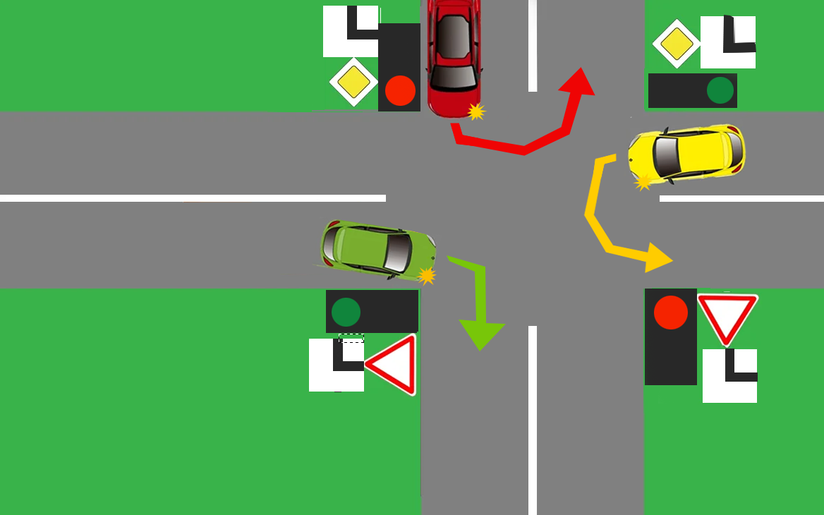 С водителем красной машины мы разобрались, у нее горит красный. А вот у двух остальных машин - желтой и зеленой горит зеленый. Для определения у кого же приоритет заглянем в ПДД, а конкретно правила проезда регулируемых перекрестков: в них сказано, что при развороте или повороте налево когда горит зеленый, водитель должен пропустить другого водителя, который едет в встречном направлении или если он поворачивает направо.