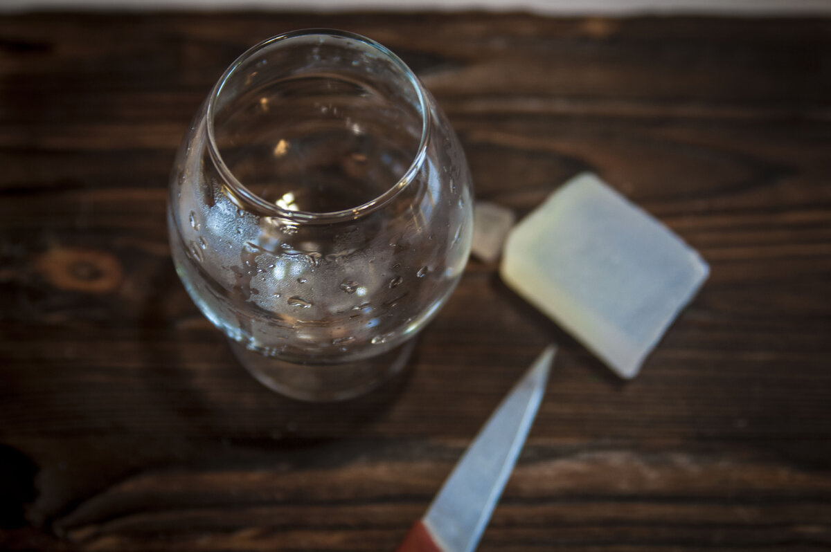 Мыловарением я когда-то очень увлекалась. Но потом - стала варить только для себя. И этот рецепт, пожалуй - самый любимый. Он простой и доступный, добавить в него можно все что угодно: витамины, крем, масла и травы. Главная фишка - это ментол. Он предает то ощущение свежести, которое я так люблю. Компоненты: Мыльная основа органическая (без лаурилсульфат натрия). Продается в интернете, в магазинчиках товаров для handmade, даже в ашане видела наборы такие. Масло косметическое жидкое. Например - оливковое, виноградной косточки, персика и т.д. Ментол кристаллический (там же, где и мыло). Можно заменить на кондитерский мятный экстракт. Итак, нам понадобится стакан из стекла, основа для мыла и нож. Нарезаем основу кубиками 2/2 см примерно, добавляем масло.