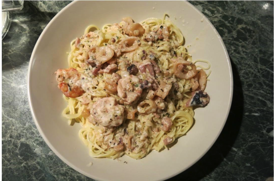 Паста с морепродуктами Ингредиенты: * Морской коктейль 500 гр. * Паста 250 гр. * Сливки 300 мл. * Сыр 150 гр. * Соль, специи по вкусу Приготовление: размороженный морской коктейль отварить 2 минуты в подсоленной воде. Обжарить коктейль на сливочном масле 1 минуту, добавить сливки, специи и потушить еще 5 минут. Отварить пасту и выложить к готовому соусу, добавить натертый сыр и потушить еще пару минут. Креветки в кляре Ингредиенты: * Креветки 500 гр. * Мука 6 ст. л. * Вода 1 ст. * Яйцо 1 шт. * Лимон 1 шт. * Масло растительное * Соль, перец полотый Приготовление: креветки очищаем, кладем в глубокую миску и поливаем соком лимона, оставляем мариноваться минут на 10. Готовим кляр: смешиваем воду, муку, яйцо, соль и специи, тщательно перемешиваем, чтобы не остались комочки. Креветки обмакиваем в кляре и жарим на предварительно разогретой сковороде с маслом 2-3 минуты Салат с морепродуктами Ингредиенты: * Морской коктейль 400 гр. * Маслины – 100 баночки * Крабовые палоч