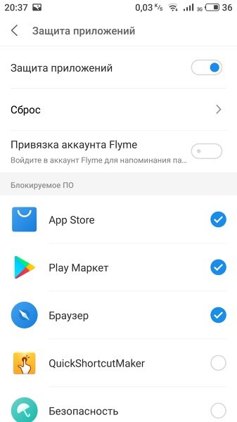 - Путь в Flyme 6: Настройки – Отпечатки и безопасность – Защита приложений.