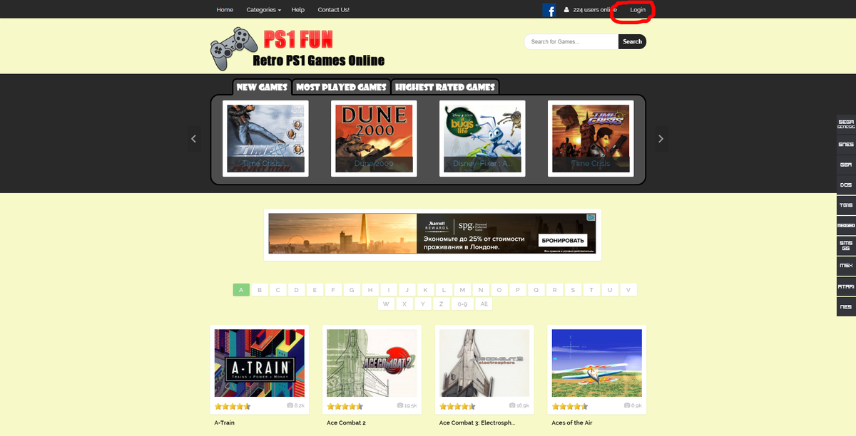 Введение: Здравствуйте дорогие читатели. Если вы зашли на эту статью значит вам не стало интересно как же поиграть в игры для старых консолей не выходя из браузера. А поможет вам в этом сайт PS1Fun. Но этот сайт позволит запускать игры не только с первой PlayStation, но и с других более старых консолей. Правда в статье мы рассмотрим для примера всего лишь один сайт, но другие работают по аналогии, ведь они от одного разработчика. Основное: Переходим по ссылке: тык Для начала нужно зарегистрироваться на сайте. Жмём на кнопку "Login" и жмём на кнопку "Register". Под цифрой 1 нам показаны игры которые добавлены недавно на сайт, самые популярные игры на сайте и игры с высоким рейтингом. Там где находится цифра два позволяет нам найти нам игры по первой буквы названия. третье-это поисковая строка (думаю объяснять для чего она не надо). И последнее, что мы выделим (цифра четыре) будет все консоли которые в которые вы сможете сыграть. Правда для игры на других консолях вас перебросит на тема