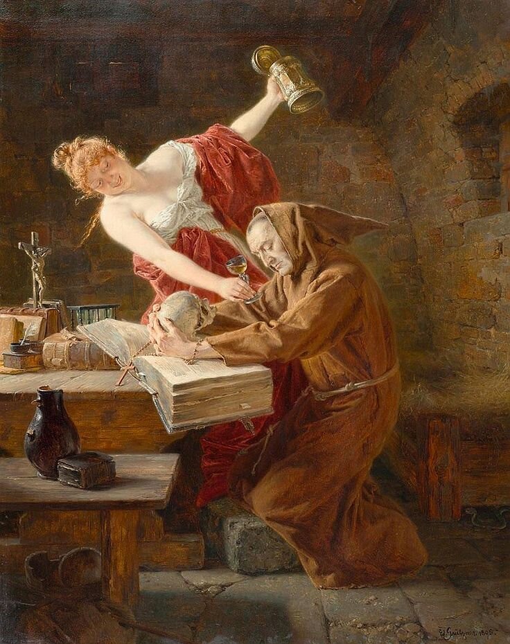 Случилось как то келейный настоятель отправил одного из своих самых усердных и послушных монахов в уездный городок к тамошнему лекарю, ибо нестерпимы стали его боли, а лекарства хоть как-то помогли бы облегчить учесть его. Путь предстоял нелегкий, идти надо было через дремучий лес и крутые горы, и случилась беда с монахом, заплутал и сбился с пути. Обессиленный на третий день выбрел он на одинокий домик в лесу. В доме том жила молодая вдова. И вот он просится к ней на ночлег сил набраться. На что она ему говорит: - Впущу я тебя странник, но при условии, что ты выполнишь одно из трёх моих желаний: возлежать со мной, зарезать скотину к столу или отведать вина. Все мы знаем, что монахи народ сдержанный, и приносят обеты послушания, целомудрия и воздержания от всякого греха. Но слишком истощен был наш инок, и подавшись искушению стал рассуждать. "Убийство - тяжелейший грех! Разделить ложе с вдовою - нарушить обет безбрачия, отведать вина - ослушаться старца. Из трёх зол выпить вина сам