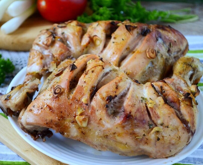 Зелень сушеная - 1 ч. л. Процесс приготовления: 1. Тщательно моем окорочка, обсушиваем бумажными полотенцами и аккуратно снимаем кожицу. 2. На куриных окорочках делаем глубокие надрезы, чтобы специи и соус проникли вглубь мяса. Кроме того, это сократит время запекания в духовом шкафу. 3. Отдельно смешиваем сок половины лимона с паприкой, перцем, куркумой и солью. Тщательно перемешиваем до однородности. 4. Окорочка со всех сторон натираем полученным маринадом и оставляем при комнатной температуре на 30 минут. 5. Тем временем делаем ароматный соус, в котором окорочка будут запекаться. Для этого смешиваем кефир с соком половины лимона, добавляем паприку, орегано, кориандр и сушеную зелень. Мелко нарезаем 1 — 2 зубчика чеснока. Добавляем в соус измельченный чеснок и тертый имбирь. 6. Обильно смазываем приготовленным соусом куриные окорочка, выкладываем их в форму для запекания и отправляем в духовой шкаф разогретый до 200 С на 40 минут. За это время еще 2-3 раза смазываем курочку соусом, в