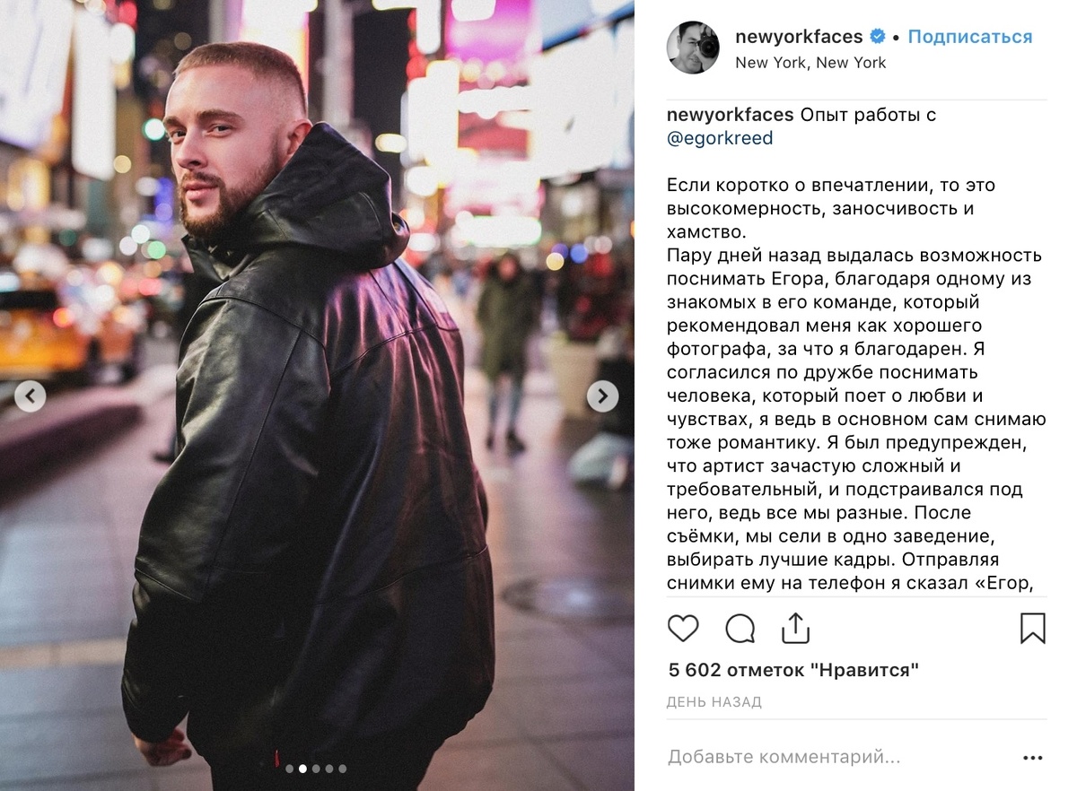 На днях у Егора Крида начался тур по Америке. Первой остановкой Крида стал Нью-Йорк: певец поделился в профиле фотографиями, сделанными известным фотографом Аркеном Аваном. Правда, авторство он предпочел не указывать, чем и вызывал недовольство Аркена. На своей странице в Instagram фотограф сам выложил снимки и написал: «Опыт работы с Егором Кридом. Если коротко о впечатлении, то это высокомерность, заносчивость и хамство. Пару дней назад выдалась возможность поснимать Егора, благодаря одному из знакомых в его команде, который рекомендовал меня как хорошего фотографа, за что я благодарен. Я согласился по дружбе поснимать человека, который поет о любви и чувствах, я ведь в основном сам снимаю тоже романтику. Я был предупрежден, что артист зачастую сложный и требовательный, и подстраивался под него, ведь все мы разные. После съёмки мы сели в одно заведение выбирать лучшие кадры. Отправляя снимки ему на телефон, я сказал «Егор, лови, надеюсь тебе понравятся». В ответ я даже «спасибо» н