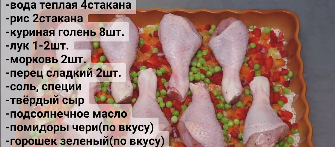3. Взять форму для запекания, смазанную растит. маслом, высыпать туда рис и распределить его по поверхности. Предварительно рис хорошо промываем. Сверху так же равномерно выложить лук с морковью, нарезанный перец с горошком, поверх ножки и помидоры. Развести в стакане с горяч. водой соль, и полить ею равномерно блюдо, затем добавить ещё 3ст. воды без соли. 3. Ставим форму в разогретую до 180град. духовку примерно на 1ч.