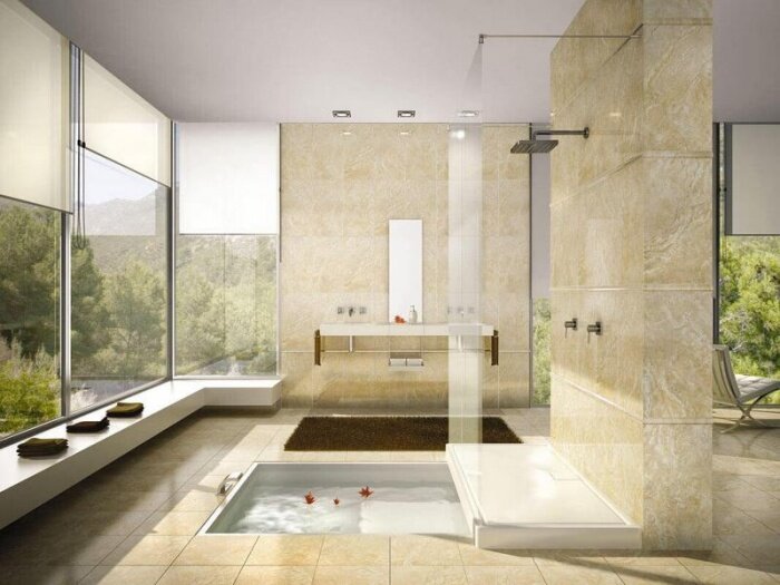 - Глянцевую. Материал имеет блестящую поверхность, которая отбрасывает блики от падающего цвета. Эта особенность мраморной плитки для ванной позволяет визуально расширить помещение.