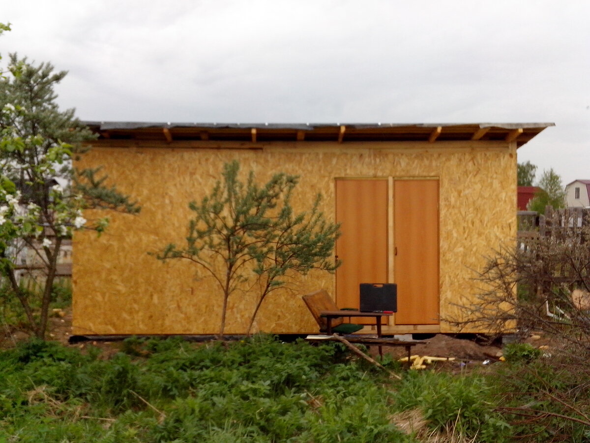 Предавали дожди,пришлось в ускоренном режиме покупать рубероид 2 видов и бежать его постилать на обрешётку крыши.Рубероида вышло на 1 тысячу рублей в Кастораме.Сначала постелил обычный рубероид в один слой и сверху него уже положил рубероид с крошкой.Прибил специальными гвоздями для этого дела. Приехала жена,пожарили шашлык.Мангал соорудил,не нужно нагибаться.Очень удобно. Навозил битого кирпича , сделал парковку у домика. Покрасил осб специальной краской.Добавил колер,цвет получился светло-жёлтый.