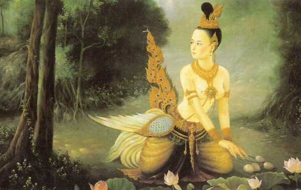 Как-то раз Сутон заблудился в лесу, устал и решил заночевать на берегу лесного озера. Он взобрался на старое дерево и уснул. Разбудило его нежное пение девичьих голосов. Сутон раздвинул ветки и увидел, что у самой воды лежат сверкающие перья, а на берегу танцуют прекрасные девушки. Все ослепительно красивы, но одна из них не знает себе равных. Принц глядел на нее затаив дыхание и не мог отвести глаз. Но вот начало светать. Танцовщицы накинули себе на плечи разноцветные перья, расправили крылья и взмыли в небо. Принц протер глаза — никого вокруг уже не было.