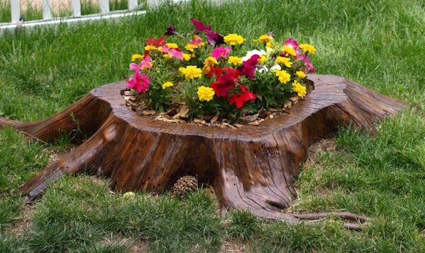 Любой садовод хочет, чтобы его дачный участок выглядел ухоженно и красиво. И в этом нам помогают цветочные клумбы. В этой статье я хочу рассказать о том, как можно красиво и дешево сделать клумбу своими руками. Для этого не понадобятся особые знания, а для оформления мы будем использовать подручные предметы, которые найдутся у каждого садовода. Есть дачники, которые используют для оформления бутылки, шины, старые сапоги и подобное вторсырье. Но, мне кажется, что такие клумбы выглядят небрежно. Поэтому, сегодня речь пойдет о классических материалах. 1. Клумба из старого пня Если у вас в огороде есть пень, не спешите его корчевать. Из него может получится отличный цветник, который естественным образом впишется в ландшафт вашего участка. При наличии бензопилы, на создание такой клумбы уйдет не более одного дня. Весь процесс создания умещается в несколько шагов: После того, как пропитка высохнет, засыпаем нашу клумбу плодородным грунтом. Все готово, можно сажать цветы. Для нормального