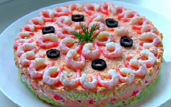По истине королевский салат! При том, как на вид, так и на вкус! Невероятно нежное сочетание крабовых палочек и креветок с сыром и яйцом, щедро сдобренных интересным и необычным соусом из икры мойвы и майонеза (ну и для сытности конечно же добавим немножко картошечки, куда же мы без нее?)), не оставит равнодушными даже самых изысканных гурманов. Салат выкладывается слоями, украшается и в результате выглядит как торт. Можно слои повторить несколько раз, если у вас кольцо маленького диаметра, но мне нравится именно когда салат выложен в кольцо внушительного размера, так он больше напоминает настоящий торт. Итак, нам понадобится: 200 грамм мелких вареных очищенных креветок 180 грамм икры мойвы 200 грамм крабовых палочек 3 вареных яйца грамм 150-180 твердого сыра пара вареных картошек грамм 100 майонеза несколько маслин и веточек любой зелени - для украшения. Рецепты праздничных салатов можно посмотреть еще тут: Красивый праздничный салат из простых продуктов - "Гранатовый браслет"