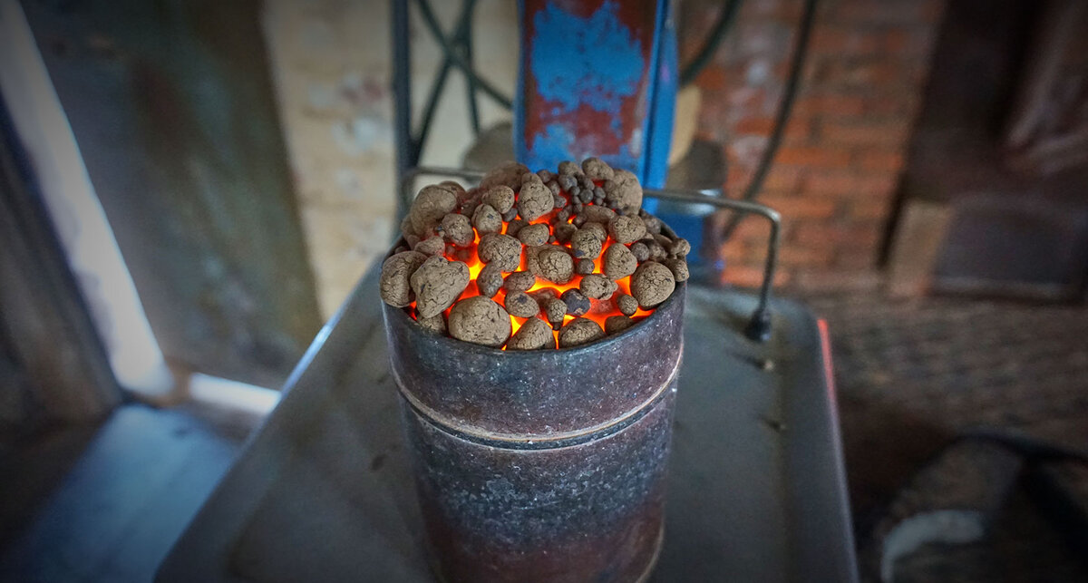 Обзор производства: оборудование, технология и фотографии с завода в Чувашской Республике. Глина Керамзит делают из глины. Добывают её в карьере открытом способом. Чтобы получить теплый керамзит, а не запеченные глиняные шарики, добывают специальную глину. Она легкоплавкая и содержит много окислов железа. Поэтому глина хорошо вспучивается. Продукция получается теплой и легкой. Из карьера глина транспортируется в глинозапасник, где она отлёживается перед обработкой. Гранулирование Большой подвесной ковш, который называют грейфером, перемещает глину по глинозапаснику до зоны перемешивания с опилом в глинорыхлителе. Опил – это мелкая древесная пыль. Натуральный материал, который остается на предприятиях деревообработки. Его добавляют в глину. Он выгорает внутри керамзита, оставляя вместо себя поры, снижающие вес и придающие дополнительно теплоизоляционные свойства. Такая добавка в глину экологичнее, по сравнению с отработанным машинным маслом, которая тоже увеличивает пористость керамзит