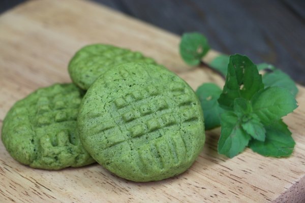 0,5 ч. ложки разрыхлителя для теста Приготовление: В отдельную миску кладем свежие листья мяты, всыпаем сахар, размешиваем. Разбиваем погружным блендером в однородную массу.Добавляем нагретое до комнатной температуры сливочное масло, вбиваем яйцо и при помощи блендера смешиваем всё в однородную массу. В результате получается довольно густая паста насыщенного мятного цвета. Смешиваем муку и разрыхлитель и, постепенно добавляя в нашу зеленую массу, замешиваем тесто. Тесто получается довольно мягкое и липковатое, но муку больше добавлять не надо, чтобы печенья получились нежными и мягкими.