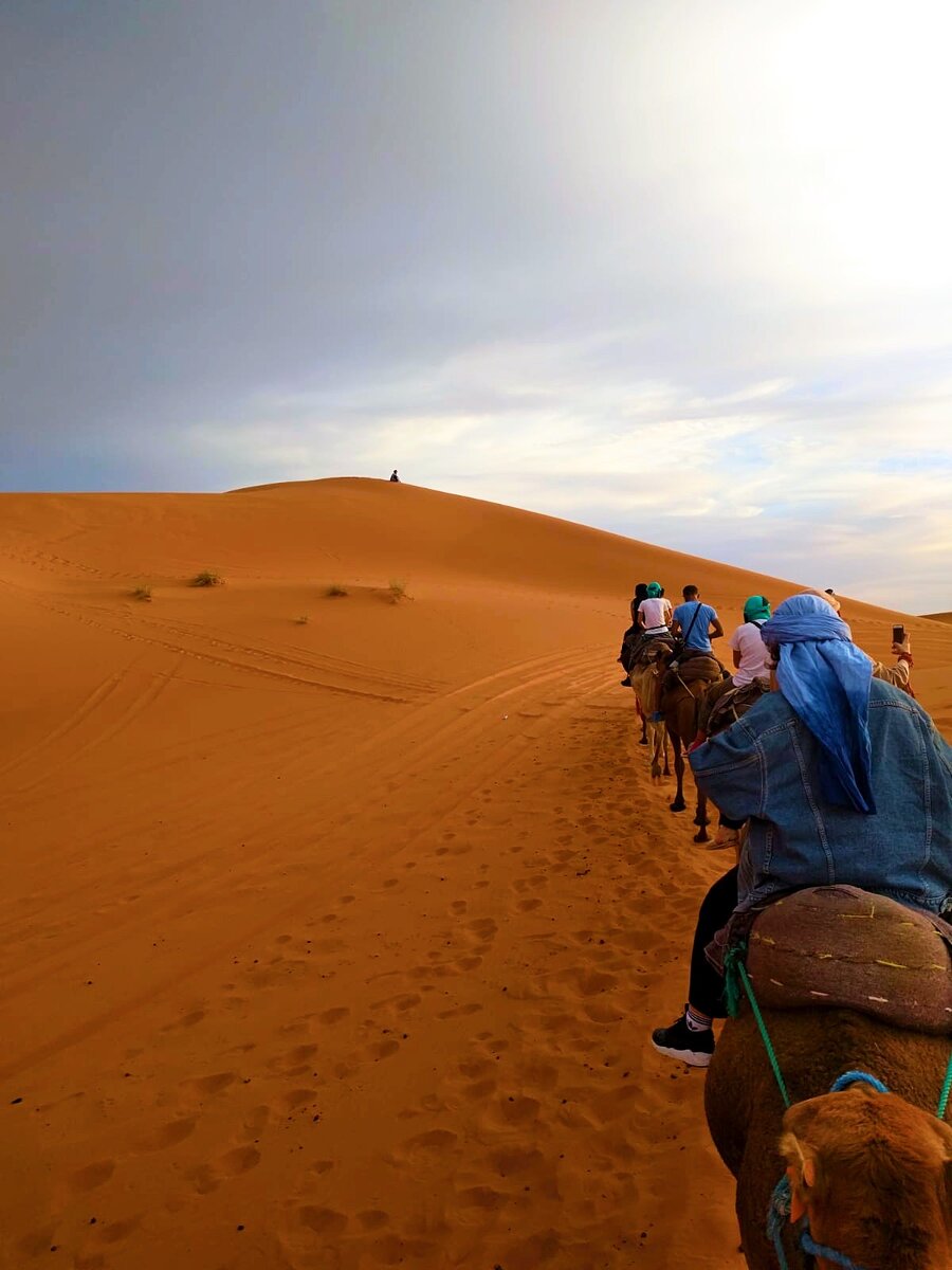 В Марокко у меня каждый день бывают моменты, когда я чувствую себя героиней восточной сказки. И это был один из таких моментов, точнее, самый яркий из них: берберы помогли правильно завязать платок, подвели глаза снизу широкими стрелками. Далее были верблюды и путешествие вдаль Сахары на них. Впереди смело шел маленький мальчик, путая ноги в песке и сражаясь с поднимающимся ветром. Но он храбро тянул за собой нашу вереницу послушных верблюдов. В голове сразу же заиграла восточная мелодия, сознание нарисовало меня героиней какого-нибудь известного фильма- со всех сторон на меня начали смотреть бесконечные камеры. Конечно, этого всего не было- мы просто углублялись в пески, но это ощущение не забыть.