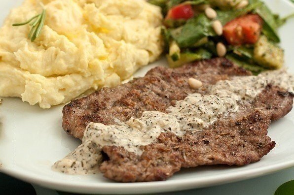 Сливки 20-22% 150 мл Приготовление: Нарезаем телятину (поперек волокон) кусочками по 1,5 – 2 см. толщиной. Накрываем мясо пищевой пленкой, отбиваем так, чтобы толщина мяса была около 0,5 см. Отбивать нужно аккуратно, чтобы мясо не порвалось. В широкую тарелку всыпаем муку, травы и соль. Хорошо перемешиваем и обваливаем в полученной смеси отбитое мясо. Разогреваем сковороду с небольшим количеством масла, выкладываем мясо и обжариваем по полминуты с каждой стороны. Дольше обжаривать не следует, так как мясо будет сухим.