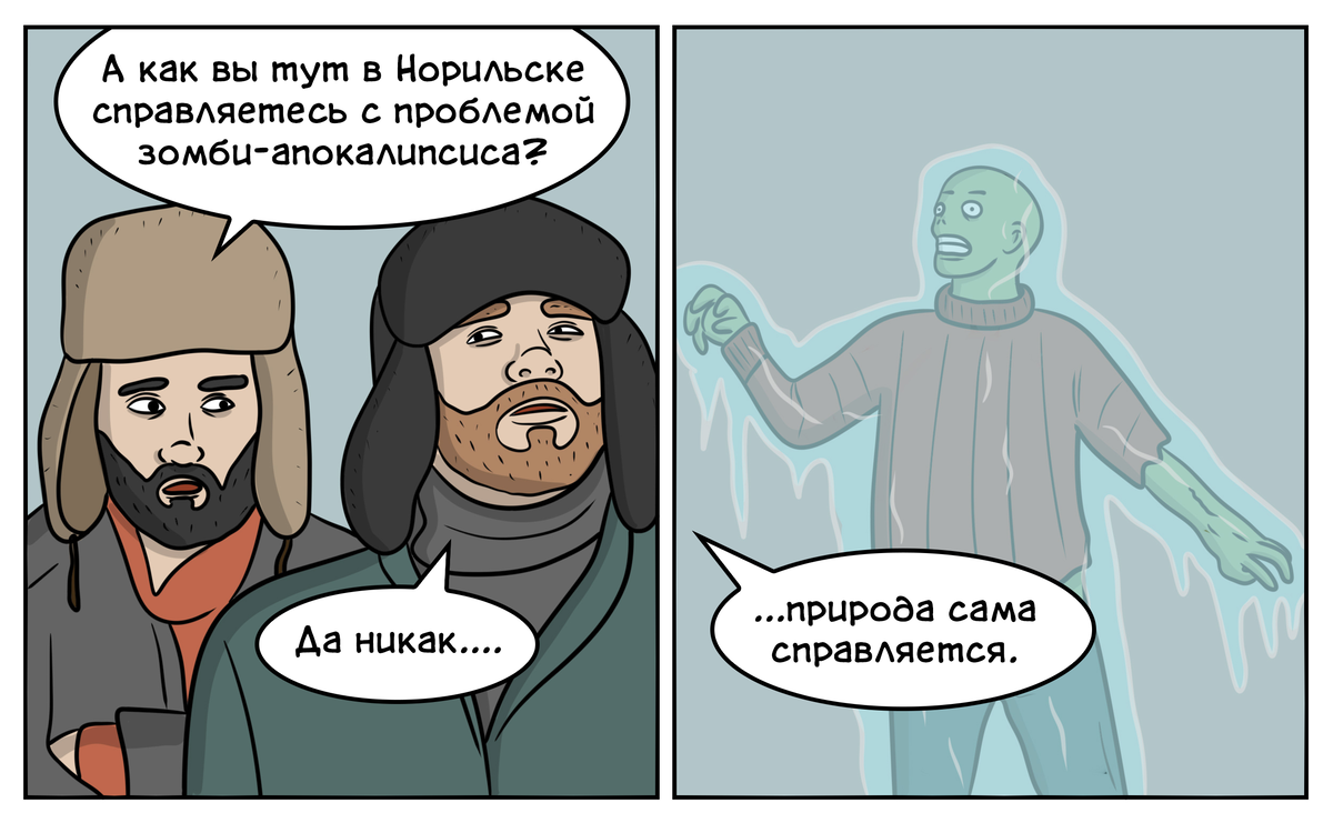 «Я люблю фильмы про зомби и вирусы. Обычно они американские и сняты в тёплых краях. А мне интересно следующее: вот настал зомби-апокалипсис, а мы живём в Сибири, и как эти зомби будут бегать за живыми при -35? А в Норильске зимой при -50? Да они окоченеют сразу, и воевать с ними не надо. Вот и получается, что живём мы не у чёрта на куличках, а у Христа за пазухой».
