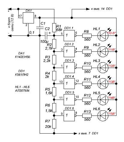 Схема бортового автомобильного вольтметра с индикацией на светодиодах приведена на рисунке ниже: Прибор представляет собой шестиуровневый линейный индикатор, в интервале от 10 до 15 вольт. Стабилизатор DA1, на микросхеме К142ЕН5Б на выводе 8, выдает напряжение 6 вольт для питания цифровой микросхемы DD1 типа К561ЛН2. Инверторы микросхемы К561ЛН2 служат пороговыми элементами, представляя собой нелинейные усилители напряжения, а резисторы R1 – R7 задают смещение на входах этих элементов. Если входное напряжение инвертора превысит пороговый уровень, на его выходе появится напряжение низкого уровня, светодиод на выходе соответствующего инвертора будет светиться. Печатная плата бортового светодиодного вольтметра со схемой расположения деталей на ней, размером 80х45 мм изображена на рисунках ниже: При налаживании бортового светодиодного вольтметра, вместо аккумулятора подключают лабораторный стабилизированный источник напряжения на 10 вольт, установив временно подстроечный резистор, вместо