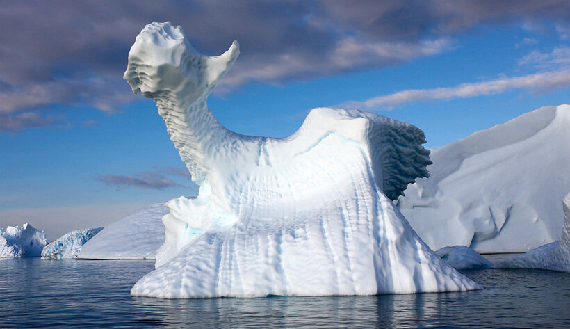 Цветные айсберги формируются, когда большие куски льда отрываются от шельфового ледника и попадают в море. Подхваченные волнами и унесенные ветром, айсберги могут быть окрашены удивительными цветными полосами различных форм и структур.