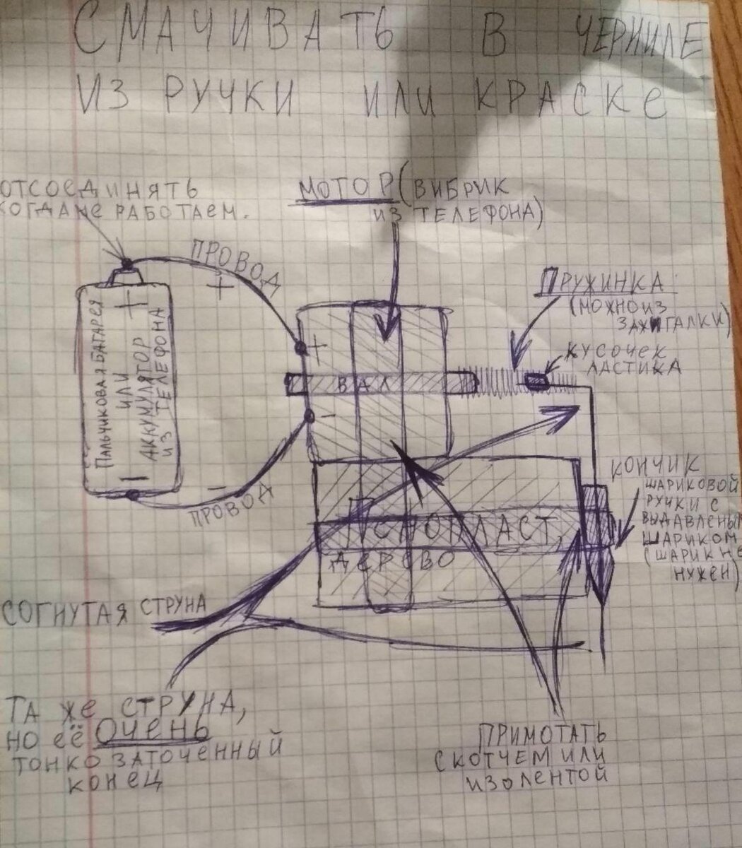 Тату-машинка из телефона! Нам понадобится: - любой телефон с вибриком - зажигалка с пружинкой - одна струна - шариковая ручка - пару проводов - ластик - кусок пенопласта или дерева - изолента или скотч - пальчиковая батарейка Достаём из телефона вибрирующий элемент (включаете вибрацию и интуитивно разбираете добираясь к месту источника вибрации, поверьте, это легко), из него будут торчать два проводка. К этим двум проводкам припаиваем (или как-то прикручиваем, приклеиваем, тут уже ваша фантазия) к пальчиковой батарейке или же к аккумулятору из этого же телефона. на вал надиваем пружинку с зажигалки, внутрь пружинки засовываем маленький ластика , внизу ластика пропихиваем струну, которая на конце должна быть тонкой как волосинка (заточить надо будет об что угодно). Надеваем на эту струну кончик от шариковой ручки (который из железа), но из него надо будет выдавить шарик. . мотаете изаленту к пинопласту, или чего угодно легкого, но прочного Чтобы машинка заработала присоединяем к одному