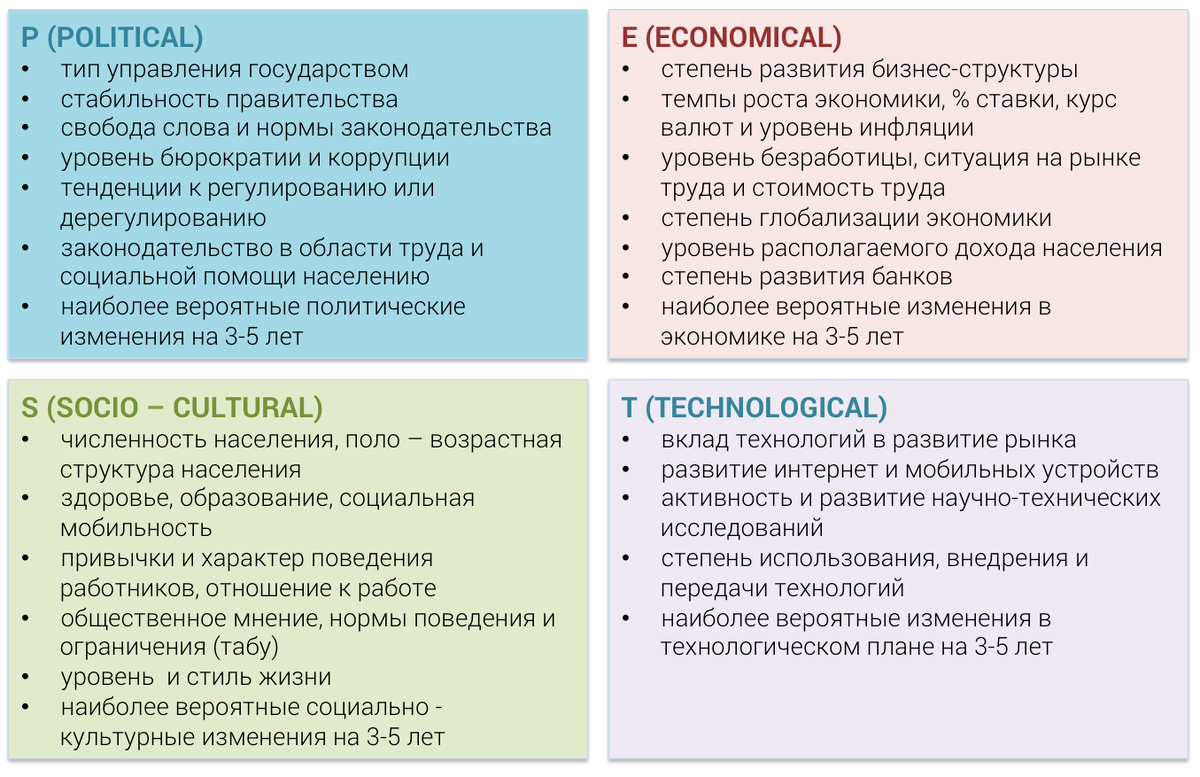 PEST анализ PEST анализ — простой и удобный метод для анализа макросреды (внешней среды) предприятия. Методика PEST анализа часто используется для оценки ключевых рыночных тенденций отрасли, а результаты PEST анализа можно использовать для определения списка угроз и возможностей при составлении SWOT анализа компании. PEST анализ является инструментом долгосрочного стратегического планирования и составляется на 3-5 лет вперед, с ежегодным обновлением данных. Может быть выполнен в виде матрицы из 4 квадрантов (см. рисунок) или в табличной форме. Мы составили максимально подробный список PEST факторов, которые обычно рассматриваются компаниями: (P) POLITICAL — политические факторы внешней среды: Факторы влияния политической среды на рынок Устойчивость политической власти и существующего правительства Бюрократизация и уровень коррупции Налоговая политика (тарифы и льготы) Свобода информации и независимость СМИ Тенденции к регулированию или дерегулированию отрасли Количественны