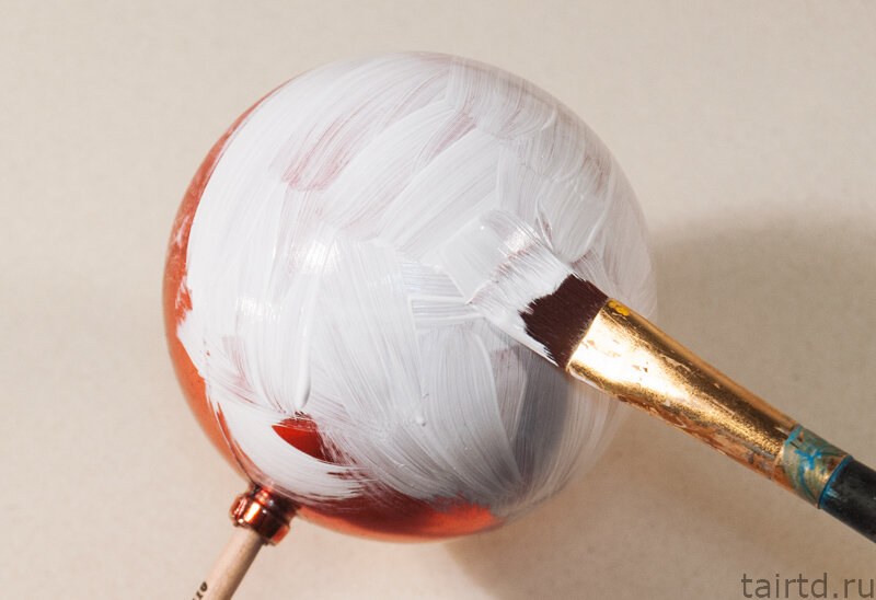 Середина ноября — пора задуматься о подарках на Новый Год. Сейчас в запасе есть ещё немного времени, чтобы сделать своим друзьям и родным приятный милый подарок своими руками, вложив в него частичку душевного и осеннего тепла. Сегодня из минимального количества материалов сделаем красивое интерьерное украшение и по совместительству — новогодний талисман для финансового благополучия. Чтобы сделать денежный талисман, нам понадобятся деньги, а точнее — монетки (ведь, чтобы получить удачу, сперва нужно в неё вложиться!:), грунт, краски, «Глиттер» и рельефная паста. Мы будем декорировать старый, потёртый новогодний шарик. Покрываем его грунтом, или же можно воспользоваться белой краской, если грунта под рукой не оказалось. Не стоит пренебрегать этим этапом, он обеспечит лучшее сцепление материалов. Очень удобно, сняв металлическую петельку, или декоративную шапочку, на которой шарик обычно подвешивают, надеть его на кисточку или карандаш. Так мы сможем крутить шар как нам удобно, не бояс
