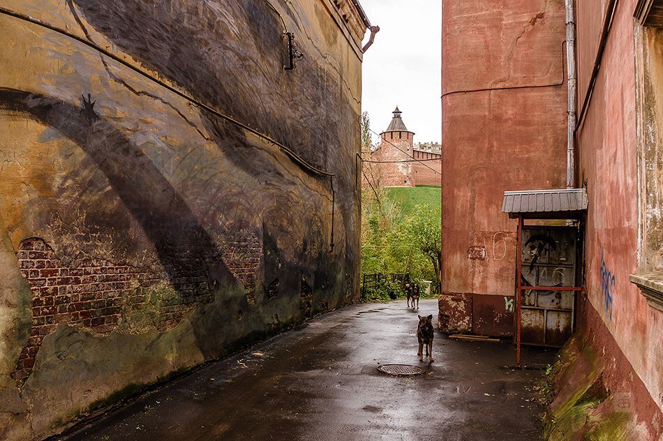 #nnwalk Горький Телеграм Думаю, каждому было бы интересно пройтись по закаулкам такой улицы, как Рождественская. Она таит в себе немало сюрпризов. Главный из них - стрит-арт. Немного подумав, я придумал стритартовский маршрут. Начнём с Ильинской, затем плавно перейдём на Рождественскую. Первый стрит-арт объект на нашем пути - темный сом. Подойдя ближе, не понятно, что это сом, но громадное видится на расстоянии. Можно найти на Ильинской 4. Топаем вперед, видим еще одну работу художников. На сей раз ее создали ребята из объединения "33+1" .Увидеть можно на арке дома на Ильинской 8. Спускаемся вниз по лестнице, и в переулке видим уже другую работу, которая нипоминает предыдущую. Прогулявшись дальше по улице, стоит зайти во двор дома на Рождественской 24, где в окна дома вставлены картины. Ровно там же найдете стрит-арт Андрея Дружаева и Андрея Оленева, который называется "самосовершенствование". Ну а если вы читали нашу статью про крышу, то на том маршруте можно встретить самое яр