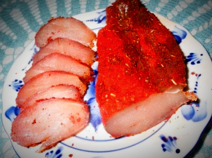 Сегодня я расскажу вам, как приготовить вкуснейшую бастурму из курицы! На приготовление уйдёт всего неделя, в отличии от говяжьей бастурмы! Итак, вот что нам понадобится: Куриная грудка - 1шт. (~300гр.) Засолка: Крупная соль - 70-100гр. Коньяк (виски, бренди) - 50гр. Обсыпка: Гранулированный чеснок - 1ч.л. Красный перец (сушёный) - 1ст.л. Паприка - 1ст.л. Сначала о грудках. Чем они больше, тем лучше. Грудка сильно уменьшится в размерах. Подготовим мясо. С грудки срезать малое филе (такой аппендикс сбоку) и всякий мелкий куриный жирок. Если его нет - вам повезло :) Проверьте на наличие косточки в грудке, она нам тоже не нужна, вырезаем, убираем. Моем наше мясо под холодной водой, обсушиваем бумажными полотенцами. Далее, в любую удобную емкость высыпаем 70-100 грамм крупной (!) соли. Прям кристаллы чтоб были. Мелкая соль для нашего рецепта не подходит, будет слишком солоно. В соль выливаем наш алкоголь, 50 грамм. Лучше использовать коньяк, можно виски, бурбон. Не стоит и
