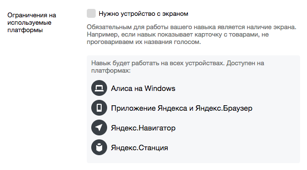 В настройках Яндекс.Диалогов появилось удобное разведение навыков по разным поверхностям. Во-первых, появилась возможность выбрать, на каких именно поверхностях будет работать навык. Во-вторых, появилась возможность протестировать, как навык работает на разных устройствах: с экраном или без. В случае тестирования навыка на устройствах без экрана не будут показываться кнопки, картинки, ссылки, — любая функциональность, которой нельзя воспользоваться. В-третьих, появилась возможность адаптировать ответы навыка под разные типы устройств. Это стало возможно благодаря свойству в meta.interfaces. Если в ответе для interfaces возвращается screen, то навык активирован на устройстве с экраном, а если ответ пуст, то без экрана. Подробнее о требованиях к навыкам для голосовых интерфейсов мы рассказывали ранее. Пожалуйста, убедитесь, что в настройках вашего навыка в Яндекс.Диалогах сейчас указаны все желаемые поверхности. Алиса и команда Диалогов P. S. Подписывайтесь на наши каналы