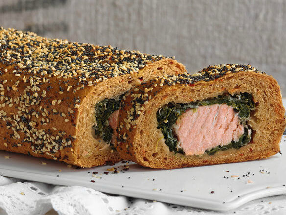 Хлеб особого вида - праздничный хлеб, наполненный филе лосося. Ингредиенты 500 г листового шпината 2 средних моркови 15 г дрожжей 200 мл воды 75 г жидкого натурального теста (самостоятельно или в мешке) 350 г пшеничной муки (тип 550) 150 г ржаной муки (тип 1150) 10 г соли (примерно 2 чайные ложки) 100 мл сладко-острого соуса чили 400 г филе лосося (свежего или замороженного) черный перец, свеже -молотый Соль тертая цедра 1 лимона 1 форма для хлеба (приблизительно 35 см) Мука для работы Жир для формы по 2 ложки семян кунжута и мака для посыпки Способ приготовления Подготовить шпинат. Помойте морковь, очистите ее от кожуры и грубо натрите. Для теста дрожжи растворить в миске с теплой водой и смешать с закваской. Добавить муку, морковную стружку и соль и все хорошо промешать. Вымешивать тесто в кухонном комбайне (8-10 мин.) на медленном темпе 4 мин., на более быстром 4 минуты) или вручную. В заключение подработать морковь и соус чили. Тесто на 15 мин.накрыть оставить при комнатной
