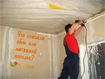 Монтаж натяжного потолка до оклейки обоев.