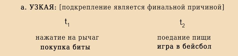 Как нажатие на кнопку и последующее получение конфеты, так и нажатие на рычаг и употребление пищи — изолированные события, происходящие в разное время. Нажатие провоцирует получение еды (действующая причина). И в будущем получение еды провоцирует нажатие (узкая конечная причина). Точно так же вы выходите из дома и покупаете биту для игры в бейсбол; игра в бейсбол будет узкой конечной причиной покупки биты.