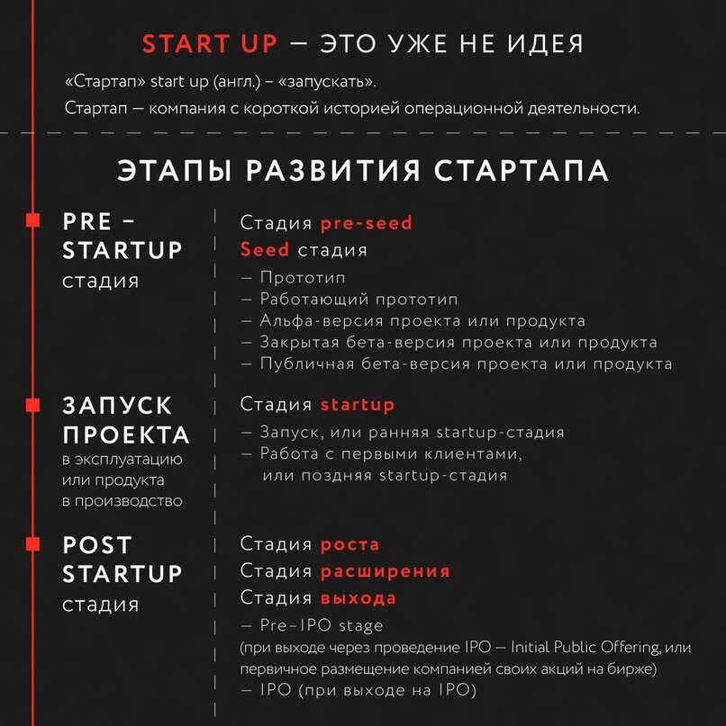 Стартап - это крутая идея. Настолько крутая, что инвестор, не раздумывая, отдаст ей все свои деньги. И так ошибаются многие. Нет. Стартап - это проект: идея, концепция, бизнес-план, команда и даже продукт. И только во все это одновременно инвестор действительно может вложить средства. Прежде чем вырасти в устойчивый бизнес, стартап проходит три главные стадии. О них вы и узнаете из этой статьи. PRE-STARTUP стадия Pre-seed stage → seed stage → prototype & working prototype → public beta