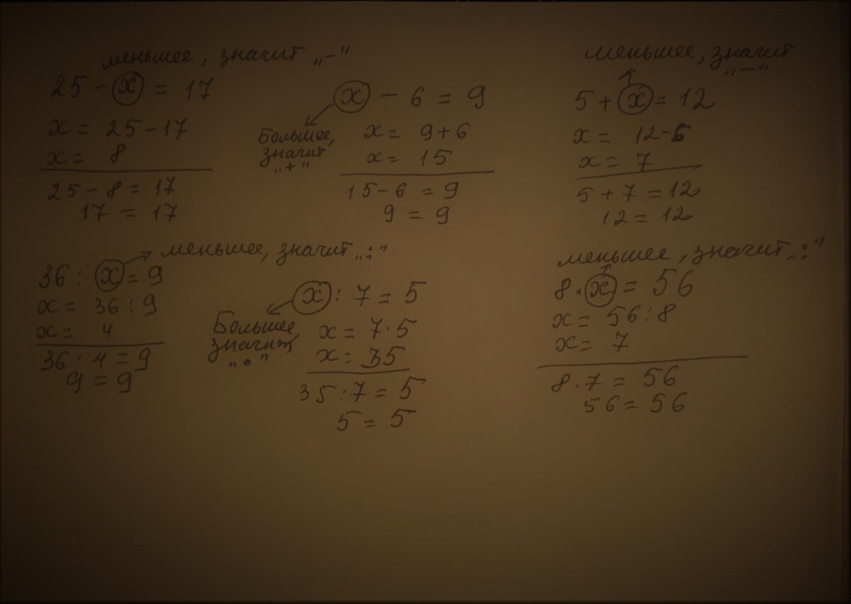 Иногда ребенку трудно запомнить названия всех компонентов действий. Ни для кого не секрет, что ребята путаются в таких понятиях, как: слагаемое, слагаемое и сумма; уменьшаемое, вычитаемое и разность; делимое, делитель и частное; множимое, множитель и произведение. А в уравнениях все правила проговорить для некоторых вообще дело невыполнимое. Ребенку трудно решать и проговаривать: «Чтобы найти неизвестный делитель, нужно делимое разделить на частное», или что-то в этом роде. Что предлагаю я. 1. Ребенок должен понять, что сложение связано с вычитанием, а деление с умножением. 2. При решении уравнений он внимательно смотрит на X и отвечает на вопрос: У нас X-это самое большое число, или меньшее? 3. Если X самое большое число, его находим сложением или умножением двух известных. 4. Если X меньшее число, то его находим или вычитанием, или делением. По такой схеме решать уравнения намного проще. С ними начинают справляться даже дети с ОВЗ. Да, названия компонентов выпали. Но хотя бы уравнен
